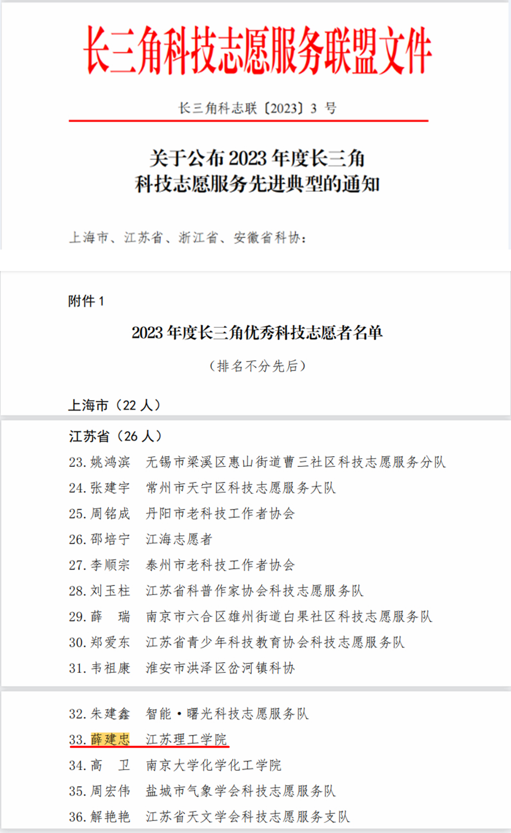 近日,长三角科志联〔2023〕3号公布了2023年度长三角科技志愿服务先进典型评选结果,我校数理学院薛建忠老师被评为“优秀科技志愿者”荣誉称号。