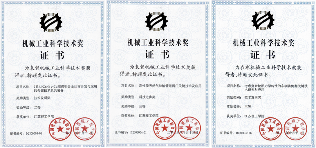 近日,中国机械工业联合会、中国机械工程学会联合发布《关于表彰2023年度机械工业科学技术奖奖励项目的通报》,我校3项科研成果荣获中国机械工业科学技术奖。其中,材料工程学院李小平博士主持的“7系Al-Zn-Mg-Cu高强铝合金丝材开发与应用的关键技术及其装备”项目以及汽车与交通工程学院李波博士与北汽重型汽车有限公司联合研发的“考虑复杂轮胎力学特性的车辆防侧翻关键技术研究与应用”项目分别获技术发明奖二等奖、三等奖,机械工程学院刘凯磊博士主持的“高性能天然气长输管道阀门关键技术及应用”项目获得科技进步奖三等奖。