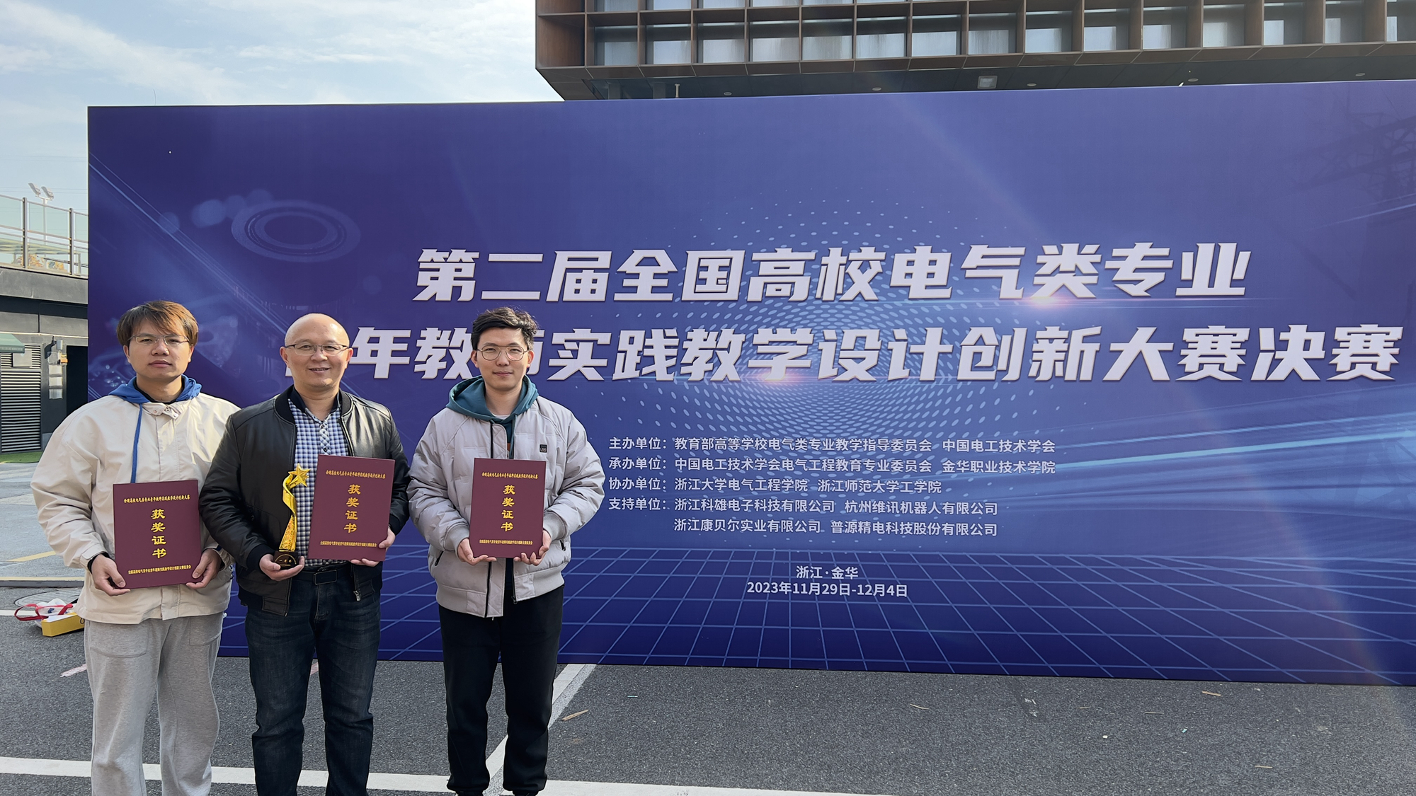 11月30日至12月2日,第二届全国高校电气类专业青年教师实践教学设计创新大赛在浙江金华圆满落幕。大赛由教育部高等学校电气类专业教学指导委员会与中国电工技术学会联合主办,中国电工技术学会电气工程教育专业委员会与浙江金华职业技术学院承办,浙江大学、浙江师范大学协办。我校电气信息工程学院组织两支队伍参赛,倪福银老师带领张文超、王召强两位学生组队参加“电工电气基础技能竞赛”,朱成喜、谢鹏两位老师组队参加“自动化系统综合应用竞赛”,两支队伍双双喜获一等奖。