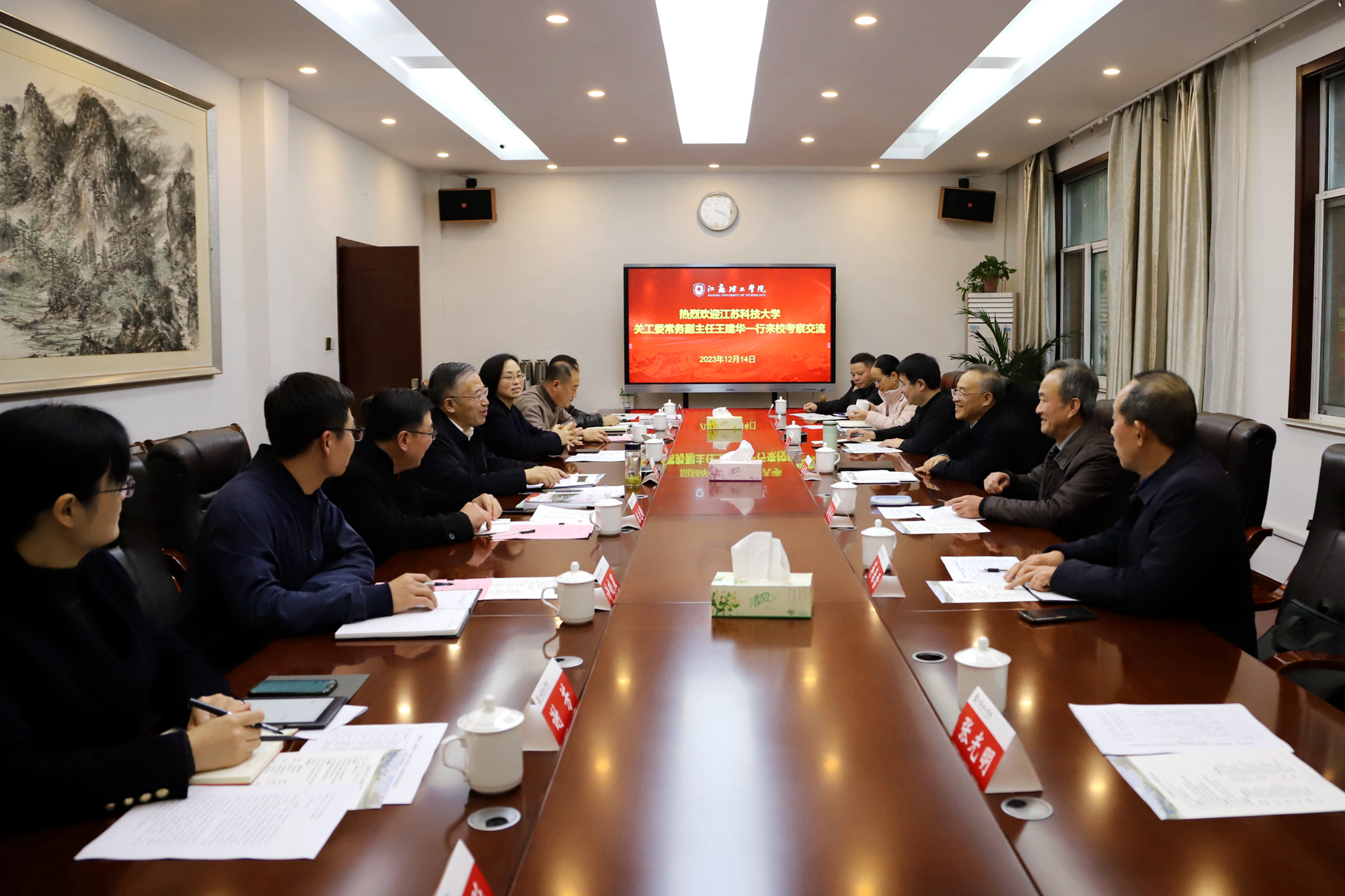 王建华介绍了江苏科技大学关工委的基本情况及在优质化建设方面的做法及经验,陈光曙围绕我校关工委组织建设、工作平台、制度建设及关工委优质化建设均衡化发展推进中的做法做了详细介绍,并对下一步工作设想达成普遍共识。与会双方针对特色品牌创建、培育活动项目、五老作用发挥展开了深入交流。