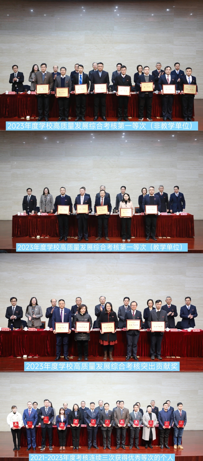 会议表彰了学校2023年度高质量发展综合考核第一等次单位、突出贡献奖单位和2021-2023年度考核连续三次获得优秀等次的个人,党委常委、副校长俞亚萍党委常委、副校长王志华宣读有关表彰文件,全体校领导为获奖单位、个人颁发奖牌和证书。电气信息工程学院、教育学院、学生工作处、教学质量监控与评估处等受表彰单位的主要负责人作交流发言。