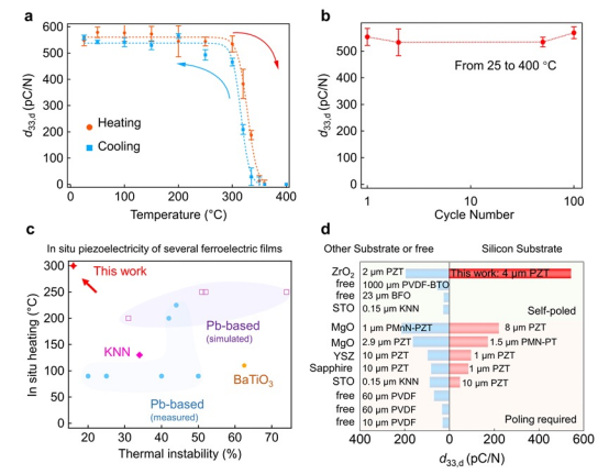 该研究提出一种自极化特性铅锆钛酸铅基薄膜,在0.5~4 微米厚度区间具有310~550 pC/N的优异压电系数,且在室温到居里温度(350 ℃)附近,其压电性能变化仅为16%,表现出优异的热稳定性,使该材料在微机电系统中具有巨大的应用潜力。原子尺度分析表明,元素成分梯度设计及晶粒高度织构促成了该薄膜卓越的自极化特性及热稳定性。该研究提出了一种有效的自极化设计策略,为应对高温封装和严苛环境下的实际应用提供了新思路。