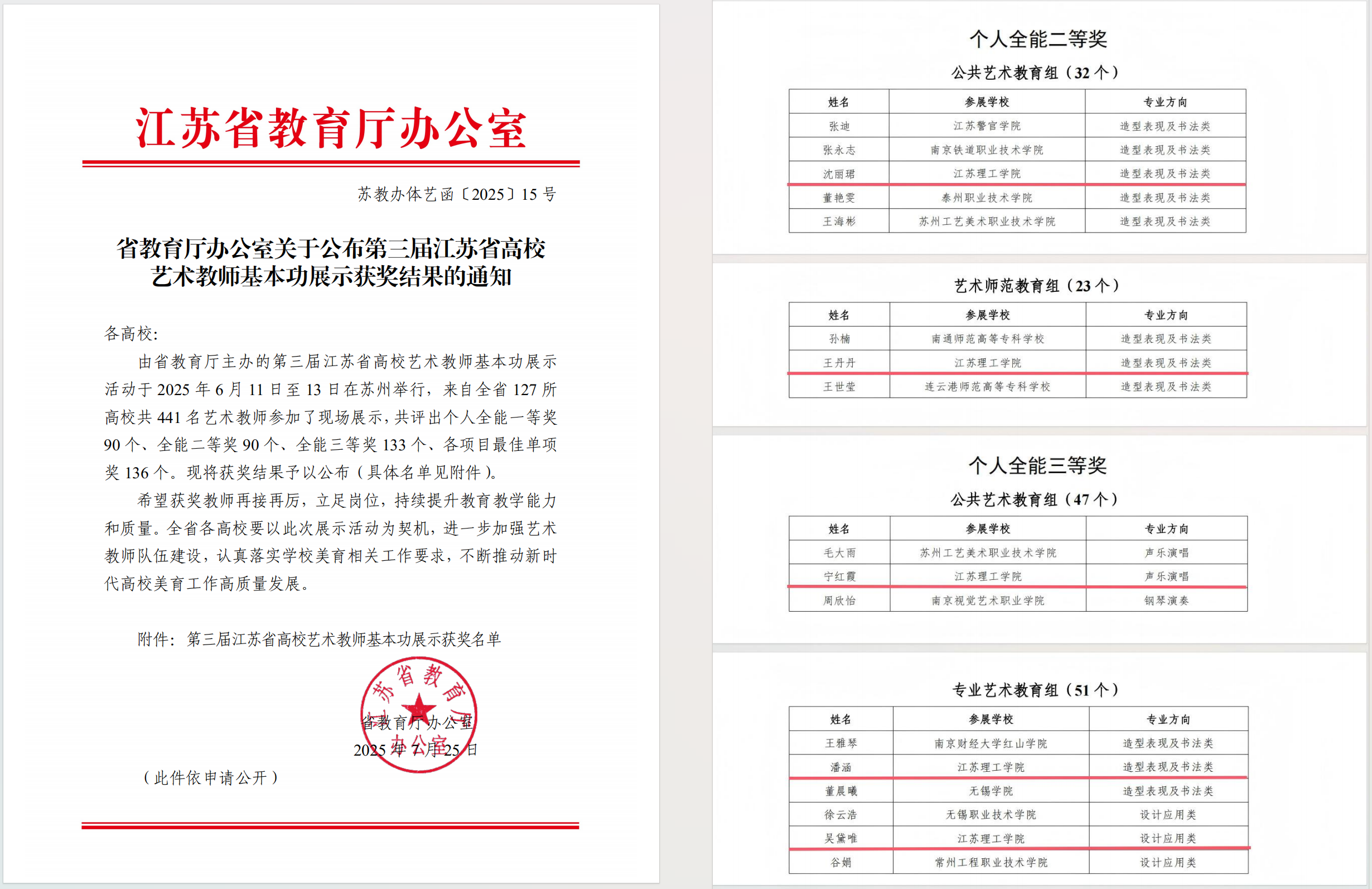 日前,第三届江苏省高校艺术教师基本功展示获奖结果公布,我校教育学院沈丽珺、艺术设计学院王丹丹分别获公共艺术教育组和艺术师范教育组个人全能二等奖,艺术设计学院潘涵、吴黛唯分别获专业艺术教育组个人全能三等奖,教育学院宁红霞获公共艺术教育组个人全能三等奖。