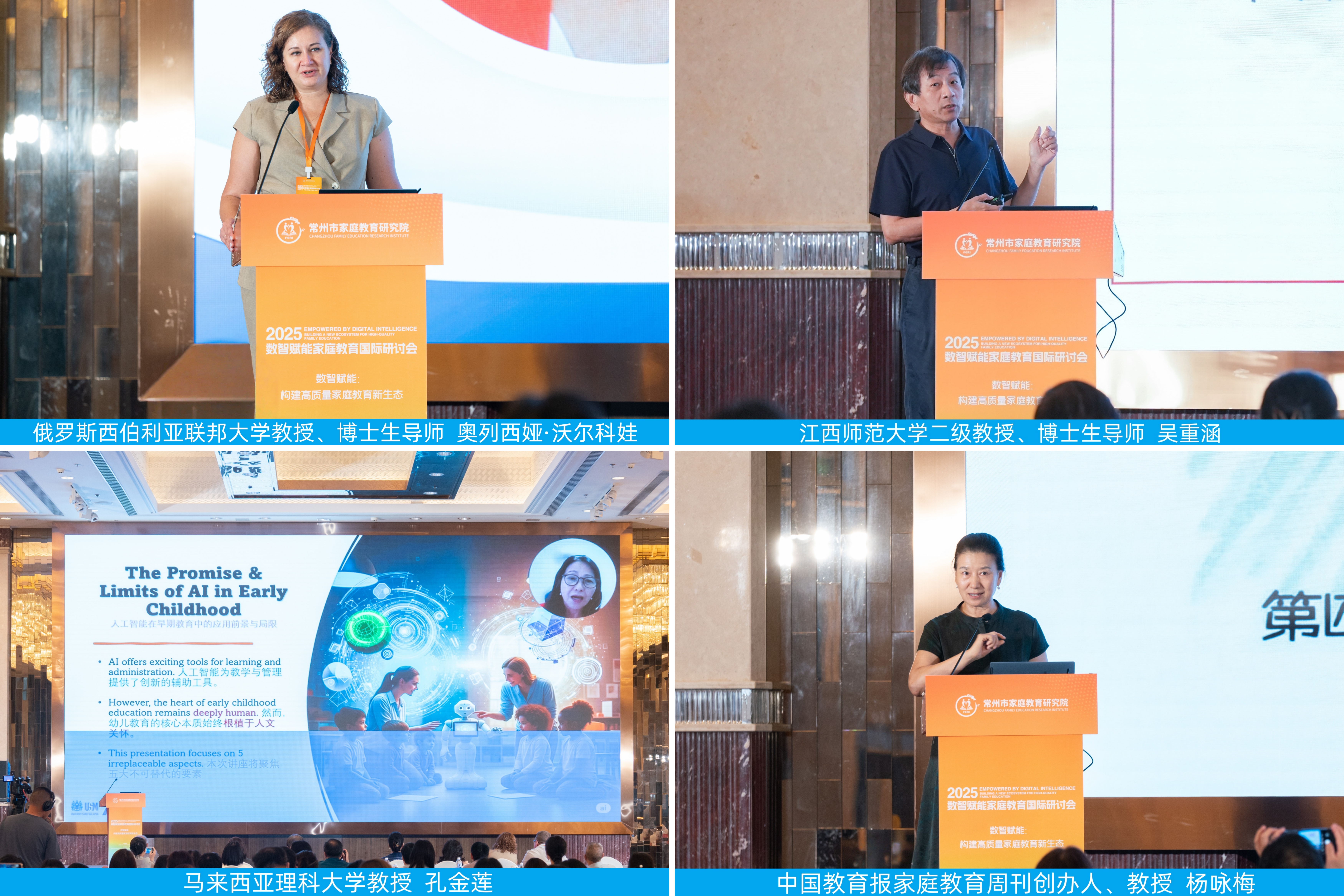 主旨报告环节,俄罗斯西伯利亚联邦大学教授、博士生导师奥列西娅·沃尔科娃(Olesya Volkova),江西师范大学二级教授、博士生导师吴重涵,马来西亚理科大学教授孔金莲(Kimberley Kong),美国杰克逊州立大学终身教授、博士生导师尹建军(Jianjun Yin),中国教育报家庭教育周刊创办人、教授杨咏梅,韩国顺天乡大学教授高映美(Youngmi Go),俄罗斯联邦卫生部太平洋国立医科大学副教授鲁斯兰·卡德罗夫(Ruslan Kadyrov)、我校青年教师孔博鉴分别作“心理咨询师VS人工智能:家庭教育问题心理援助需求者的调查研究结果”“数智时代缓解父母焦虑的逻辑与建议”“人工智能无法取代:早期教育中不可或缺的人类要素”“人工智能和数字智能时代的儿童保育和家庭教育”“数智时代家庭教育如何‘智慧爱’”“基于人工智能的聊天机器人在父母(监护人)心理教育中的应用”“人工智能赋能家庭教育:机遇与挑战”专题报告。
