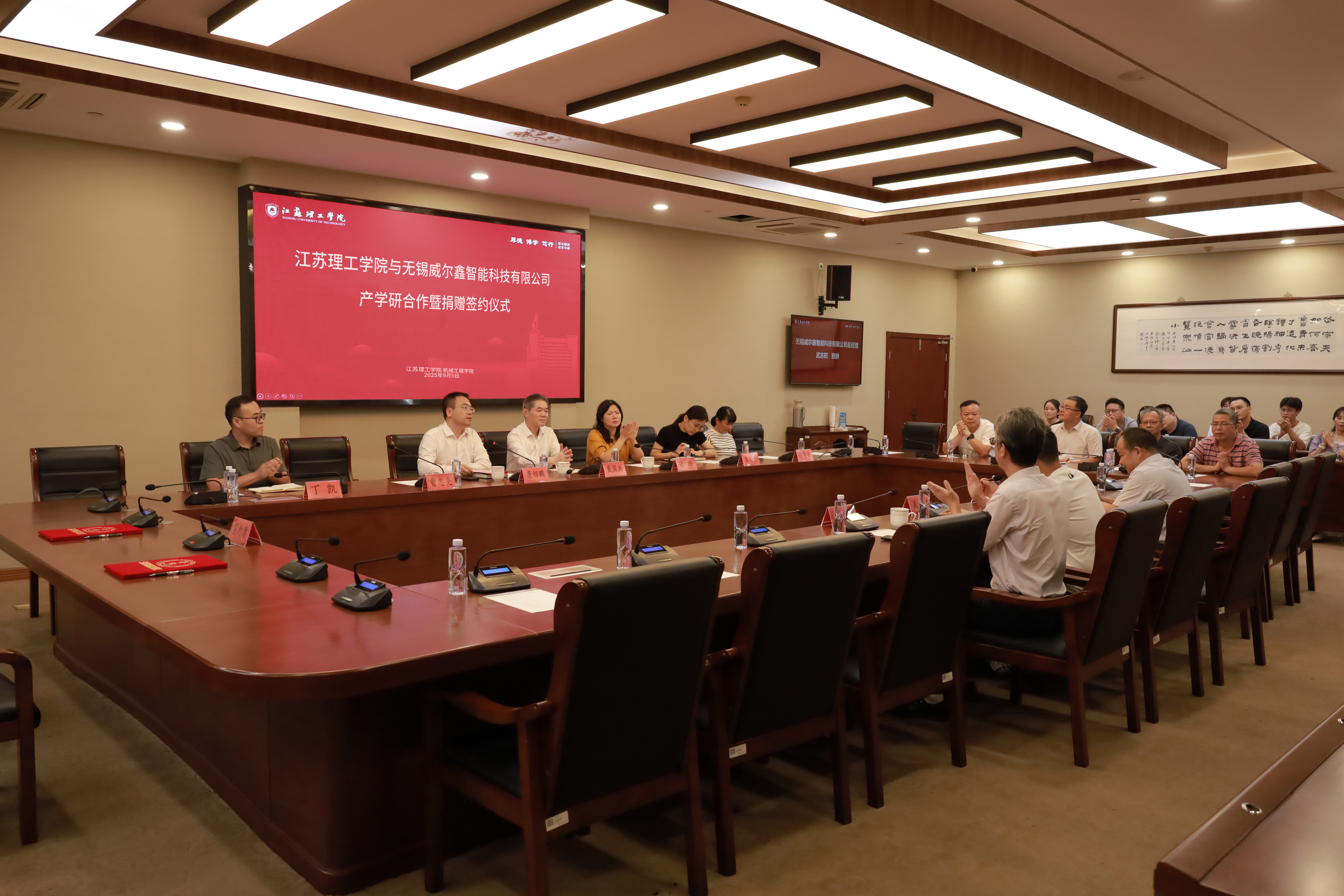9月5日上午,我校在图书馆四楼会议室举行产学研合作暨捐赠签约仪式。校党委副书记、校长戴国洪,无锡威尔鑫智能科技有限公司总经理武志旺、副总经理李忠明,校城融合工作办公室负责人,机械工程学院负责人及师生代表参加了签约仪式。