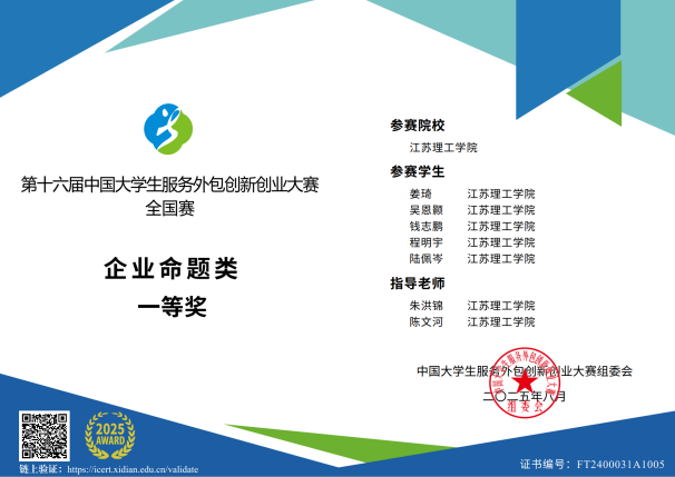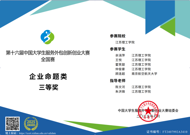 日前,第十六届中国大学生服务外包创新创业大赛总决赛圆满落幕。我校学生获全国总决赛一等奖1项、三等奖1项。