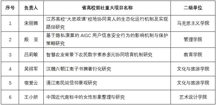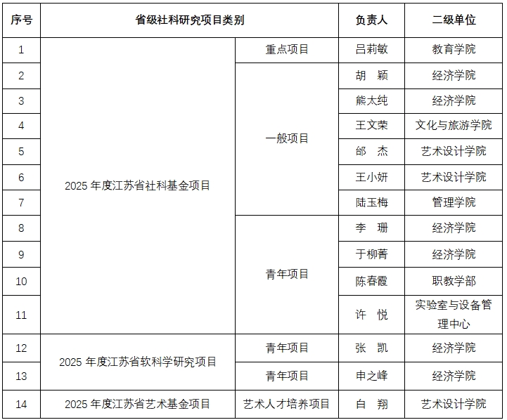 日前,江苏省哲学社会科学办公室、江苏省科技厅、江苏省文旅厅、江苏省教育厅分别公布了2025年度江苏省社科基金、省软科学研究项目、省艺术基金项目、江苏高校哲学社会科学研究重大项目立项名单,我校共获批高层次社科研究项目20项,其中省社科基金年度项目11项,省软科学研究项目2项,省艺术基金项目1项,省高校哲社重大项目6项。