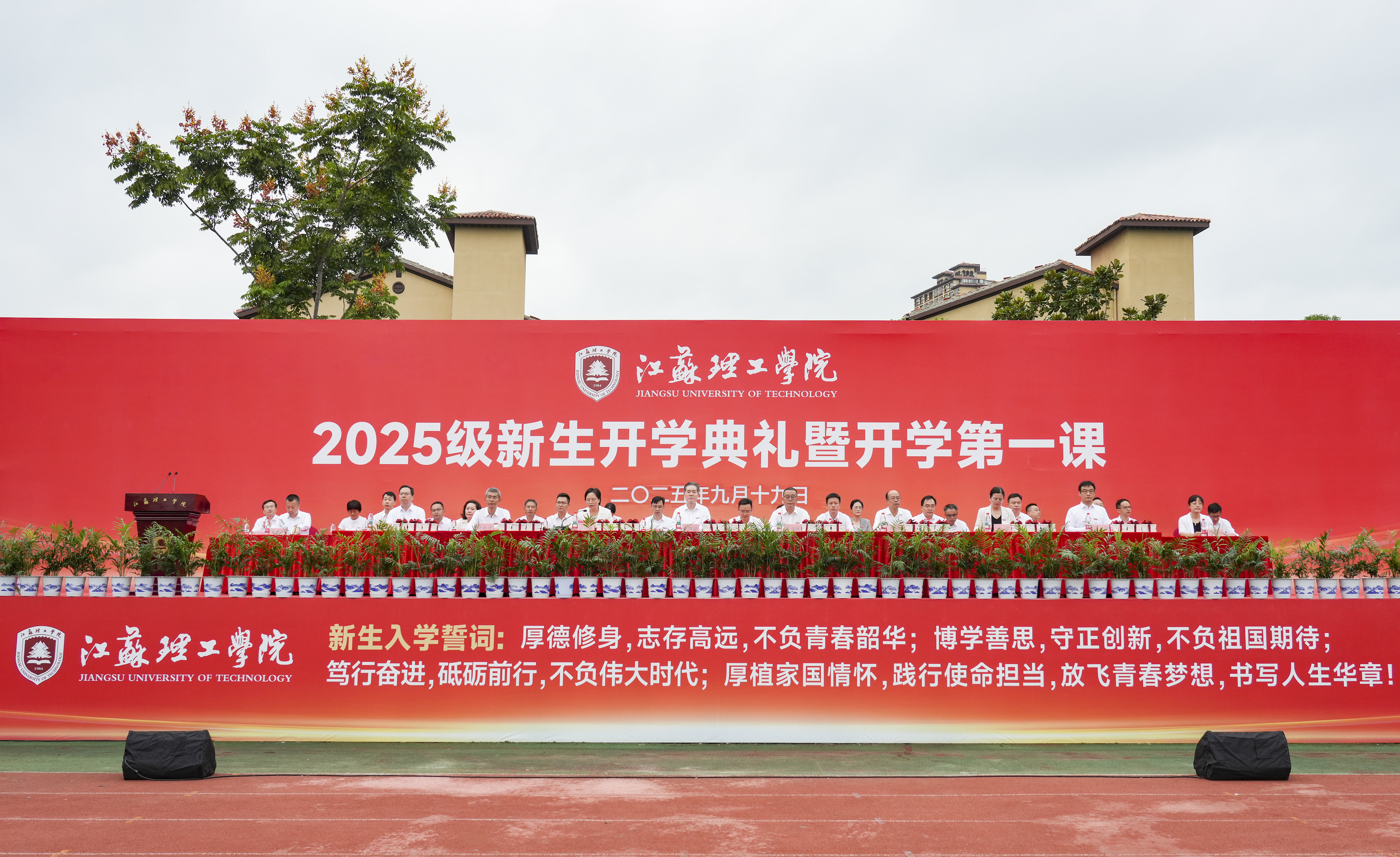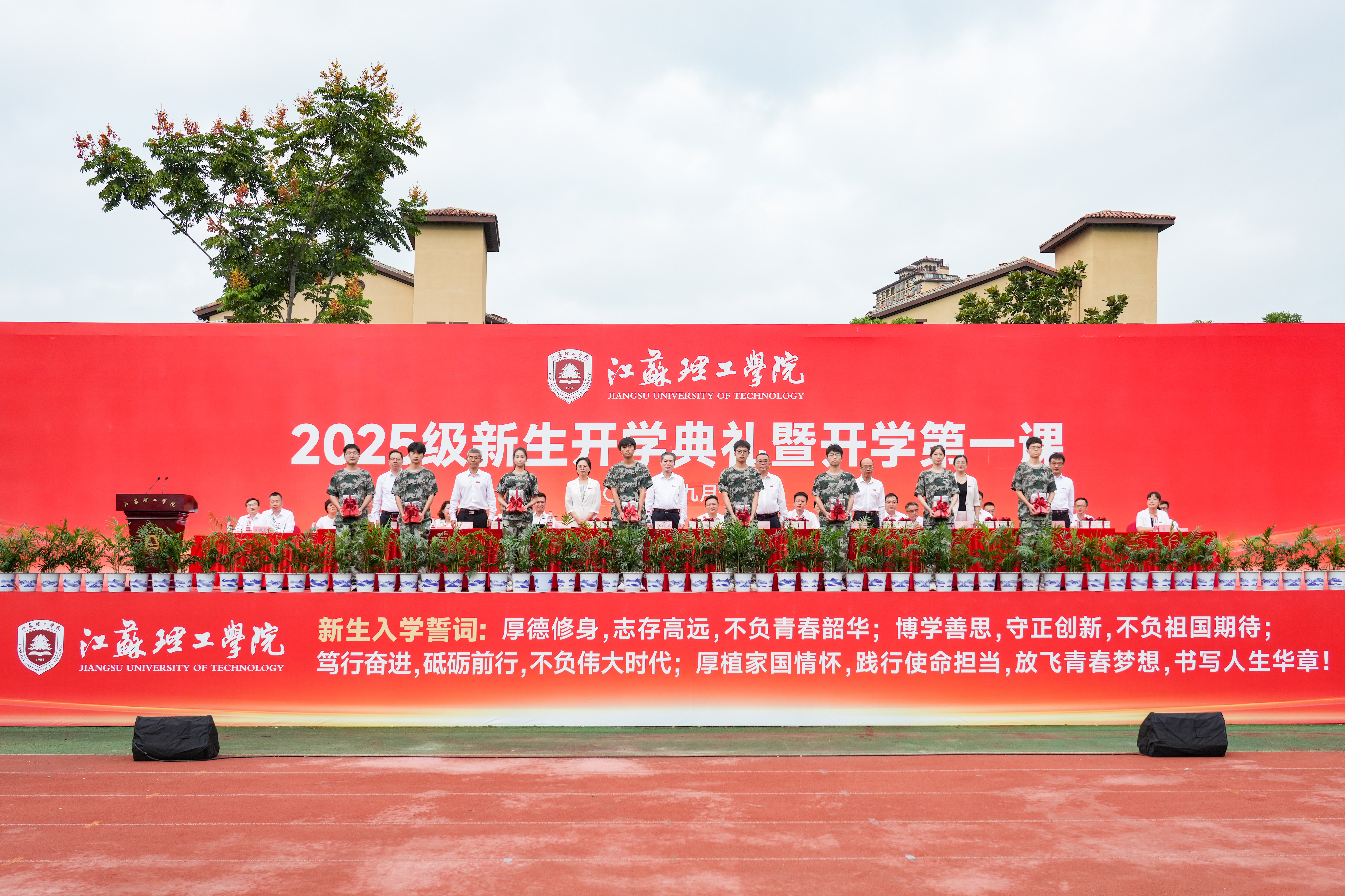 主席台前排校领导为新生代表佩戴校徽并赠送书籍。全体新生在4名同学的带领下集体宣誓。2025级新生开学典礼在《放飞梦想》校歌声中落下帷幕。(图/孔祥建、张姚 大学生通讯社:周晨熙、刘宇成、王宸瑶、聂安南、徐哲涵、常洋、赵雨辰、黎晓曦、潘杰;文/汪雨、李金东;审核/许晓星;编辑/张姚)