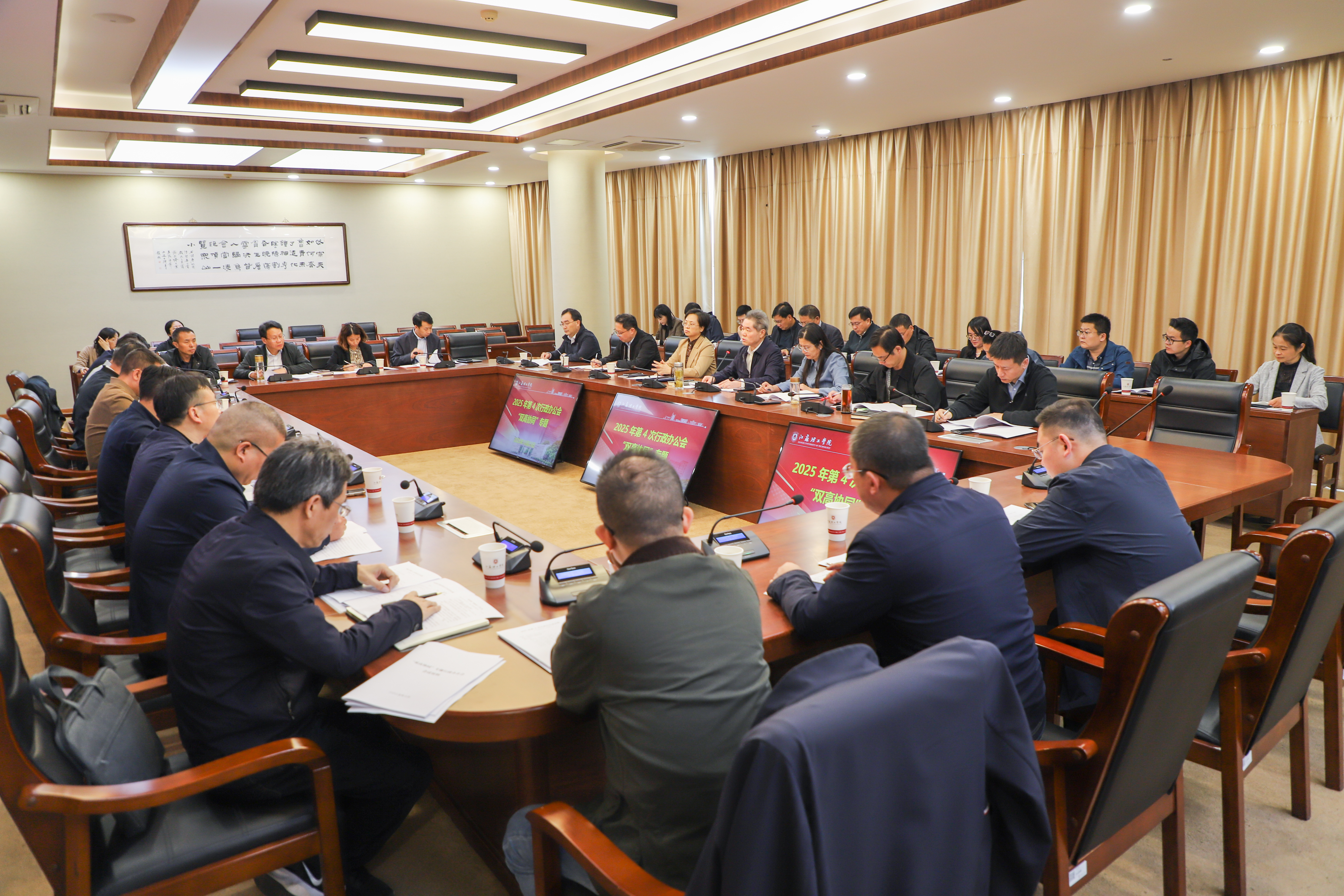 10月23日下午,我校在图书馆四楼会议室召开“双高协同”专题行政办公会。校党委副书记、校长戴国洪,党委常委、副校长俞亚萍,副校长叶霞,党委常委、副校长王俊,党委常委、副校长范洪辉以及相关职能部门、理工科学院负责人参加会议,会议由戴国洪主持。