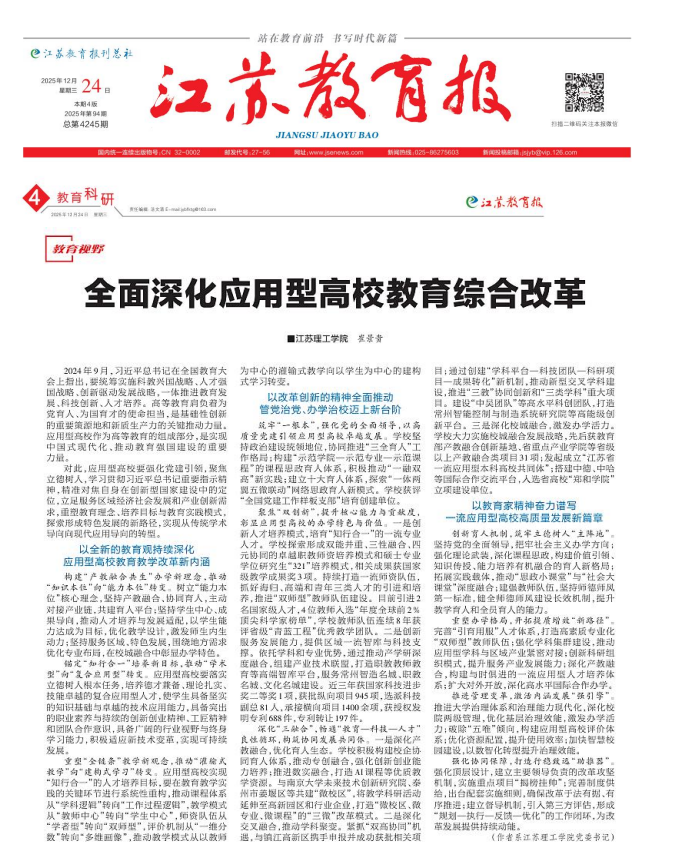 2024年9月,习近平总书记在全国教育大会上指出,要统筹实施科教兴国战略、人才强国战略、创新驱动发展战略,一体推进教育发展、科技创新、人才培养。高等教育肩负着为党育人、为国育才的使命担当,是基础性创新的重要策源地和新质生产力的关键推动力量。应用型高校作为高等教育的组成部分,是实现中国式现代化、推动教育强国建设的重要力量。
