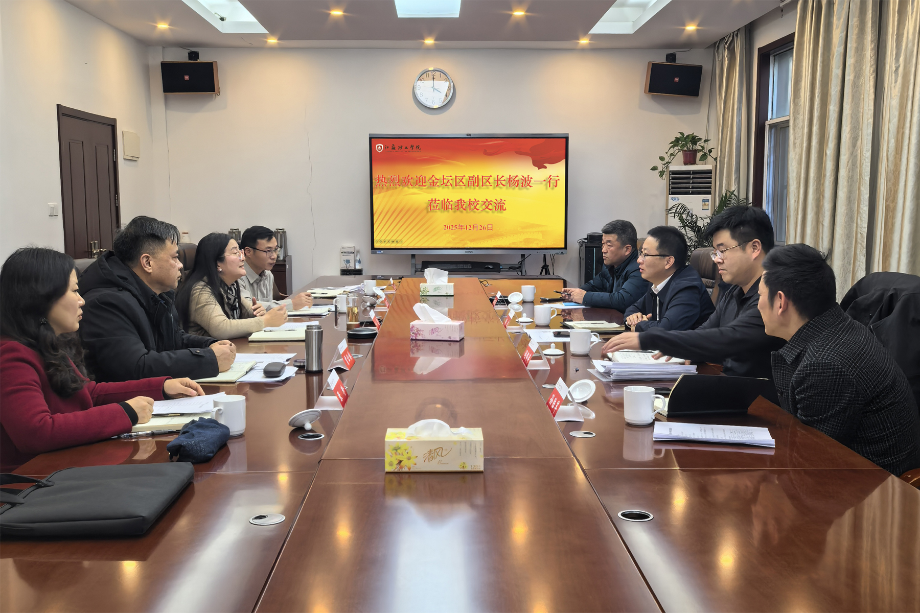 12月26日,我校校友、金坛区副区长杨波携金坛区科技局、区投资公司、华罗庚高新区管委会科技金融局等单位相关负责人来校调研交流。副校长叶霞,党委研究生工作部、科学技术处、校城融合办公室等单位相关负责人参加会议。