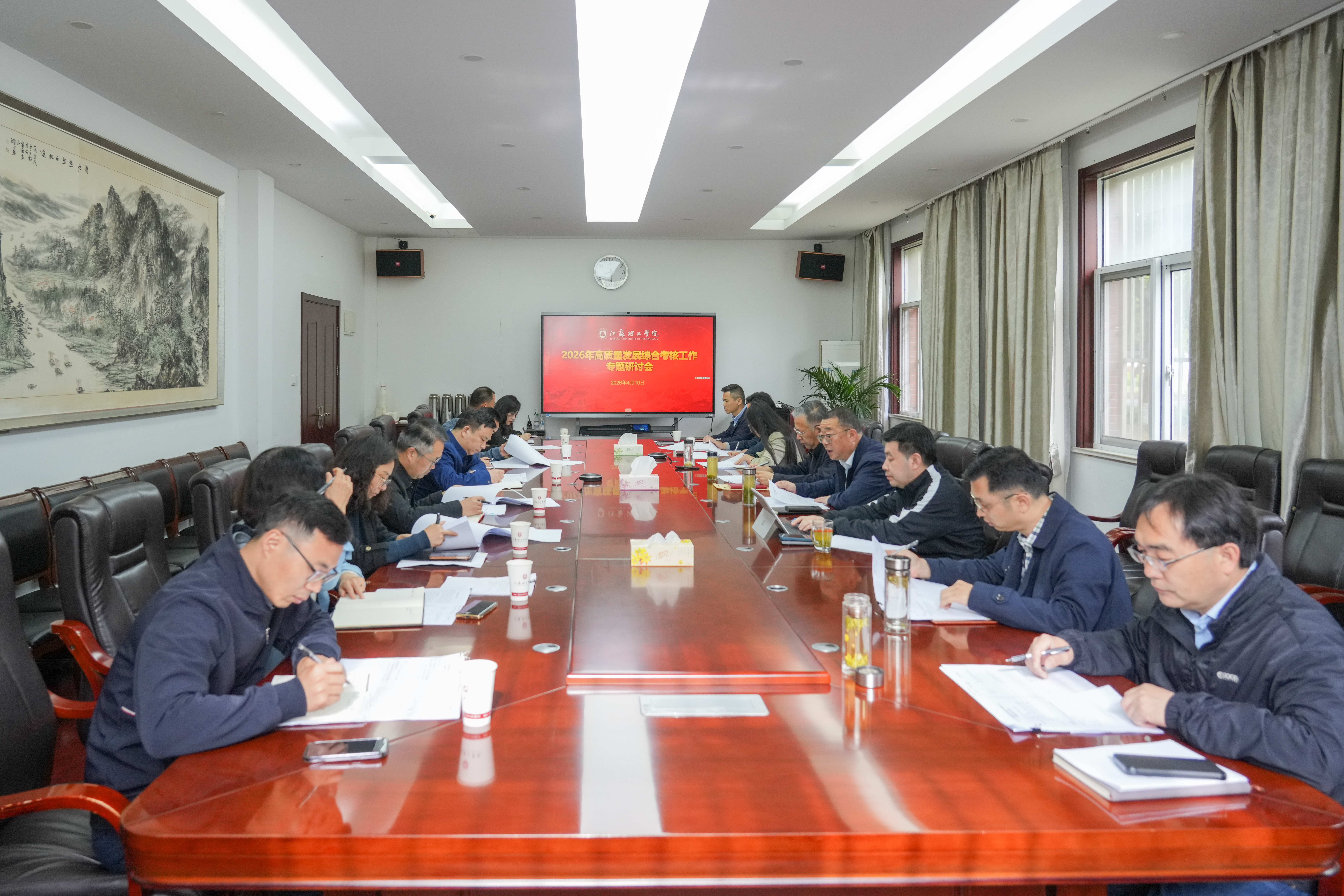 4月10日上午,我校在正德楼第二会议室召开专题会议,深入分析学校2025年度省属高校高质量发展综合考核情况,部署推进2026年度高质量发展综合考核工作。校领导崔景贵、贝绍轶,叶霞、方亮,党委常委王斌、刘晓杰,各指标牵头部门主要负责人参加会议。会议由校党委副书记贝绍轶主持。