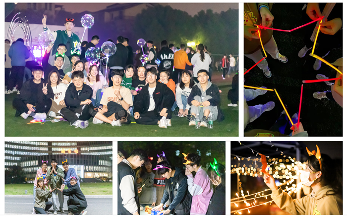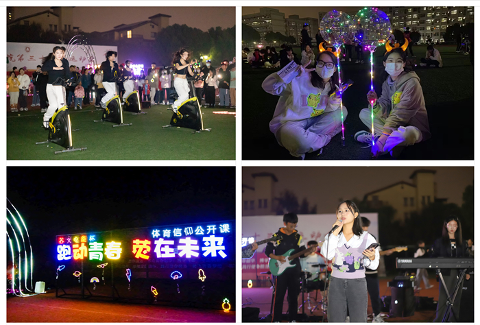 操场上,全体师生参加了“跑动青春,‘荧’在未来”夜跑活动。本次参加“荧光夜跑”活动的学生共分成40个组参赛。参赛队员按顺序从南苑体育场出发,根据工作人员提供的线索寻找过关卡点,途经图书馆、知行楼、西苑篮球场等6个卡点,在完成相应过关任务后,返回南苑操场进行二十大知识竞答。“荧光夜跑”开始前,无氧乐队、动感单车、吉他社、舞蹈队还为师生带来了精彩表演。